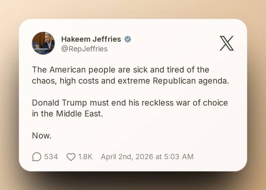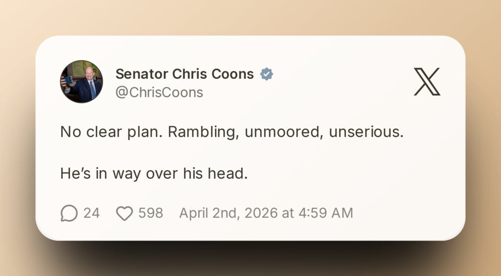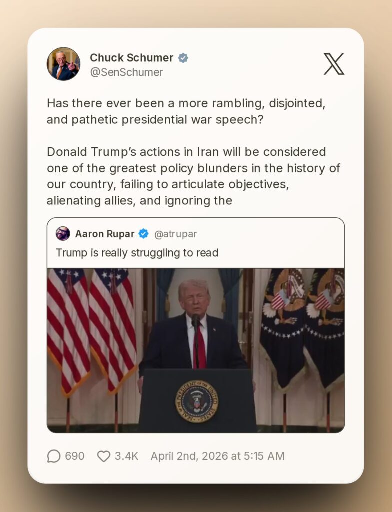 Senior Democratic leader Hakeem Jeffries condemned the administration’s approach, stating that Americans are “sick and tired” of chaos, rising costs, and what he described as an extreme Republican agenda. He urged Trump to immediately end what he called a “reckless war of choice” in the Middle East.U.S. Senator Chris Coons criticized the address as lacking coherence and strategic clarity, describing it as “rambling, unmoored, and unserious.”